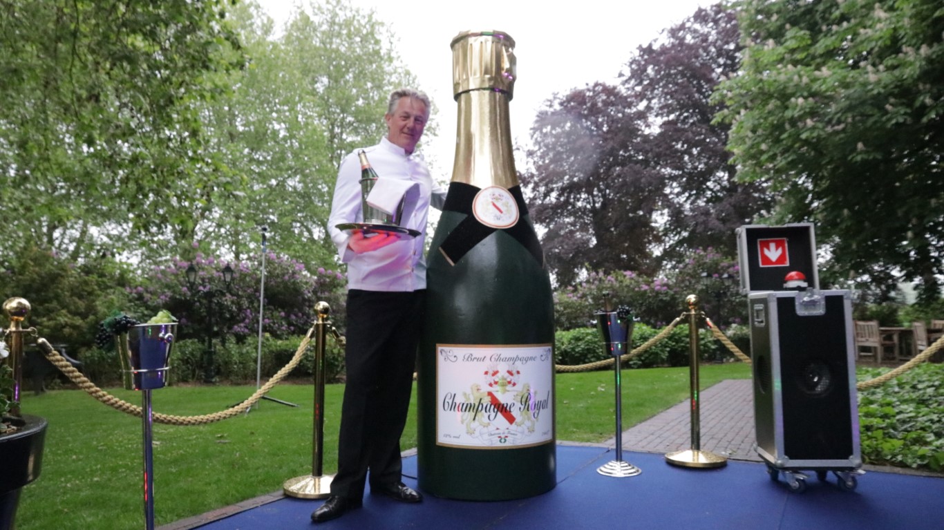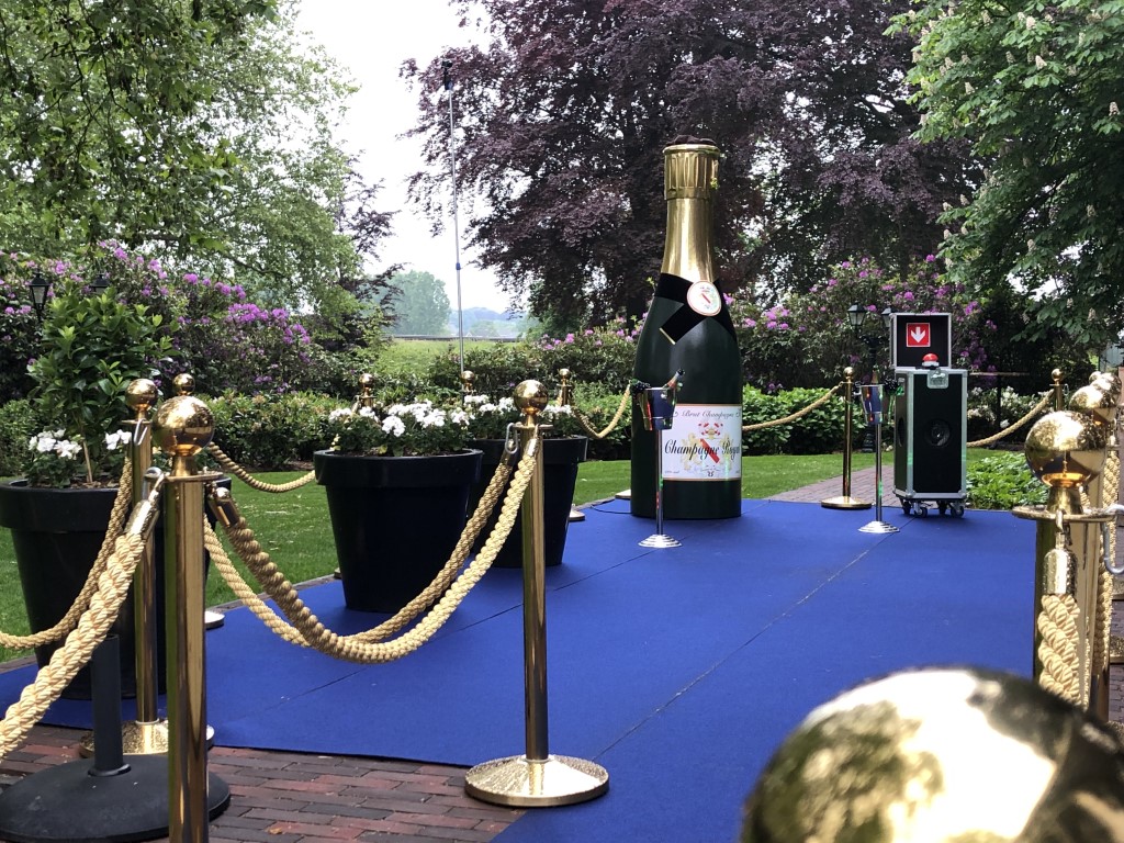 Uw gasten worden ontvangen op een prachtige koninklijke donker blauwe loper door onze speciale champagne ober, in smetteloos champagne tenue. Iedereen baant zich een weg door de koperen paaltjes voorzien van gouden koorden en champagne decoratie op weg naar de speciale ‘levende’ champagne tafel.